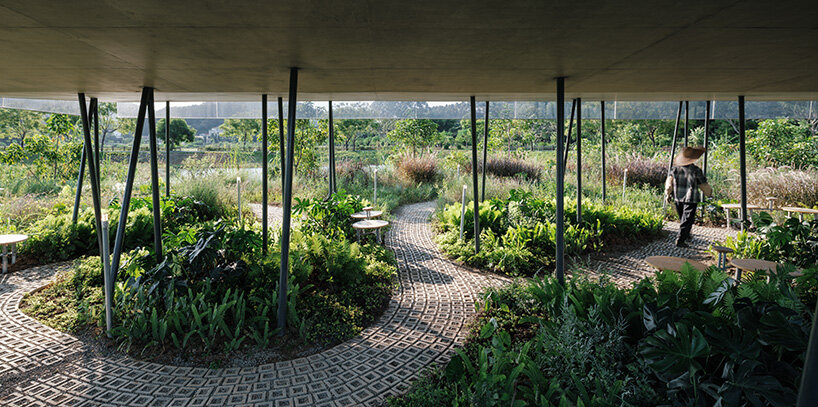Though the physical structure of the greenhouse was not retained, its spirit of cultivation remains. Atelier Guo extends this continuity through a planted gradient that dissolves the architectural perimeter, composed of shade-tolerant species that occupy the space beneath the slab, while native vegetation spreads beyond.