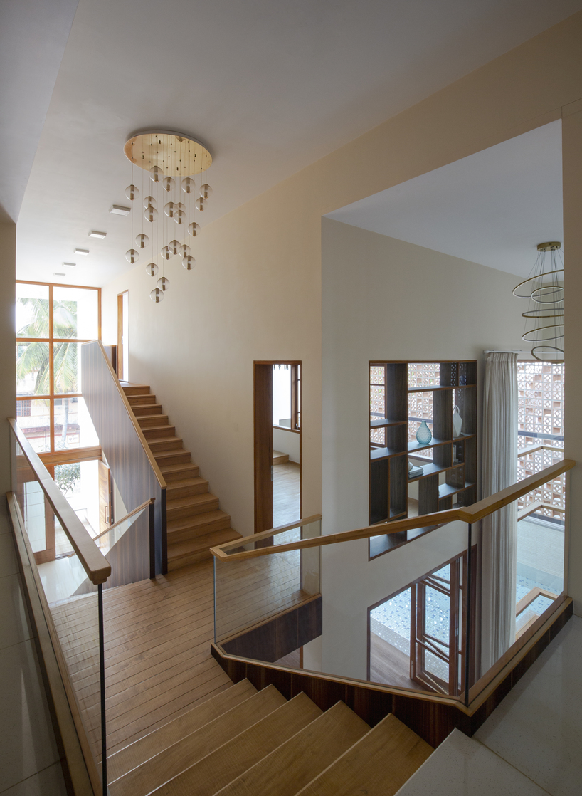 The eastern setback of the plot is reinterpreted as a pool pavilion defined by terracotta screens and a glass canopy. This zone functions as a transitional layer between the interior and exterior, mediating light, temperature, and privacy. The public areas are arranged between the transparent pool enclosure and the solid private block, creating a sequence of interconnected volumes that balance openness with enclosure. Sectional openings enable layered views across spaces, allowing soft reflected light from the pool to animate the interiors. The plan adheres to Vastu principles while maintaining spatial flexibility. The design seeks equilibrium between programmatic density and a sense of openness, aligning the client’s requirements with environmental and contextual constraints.
