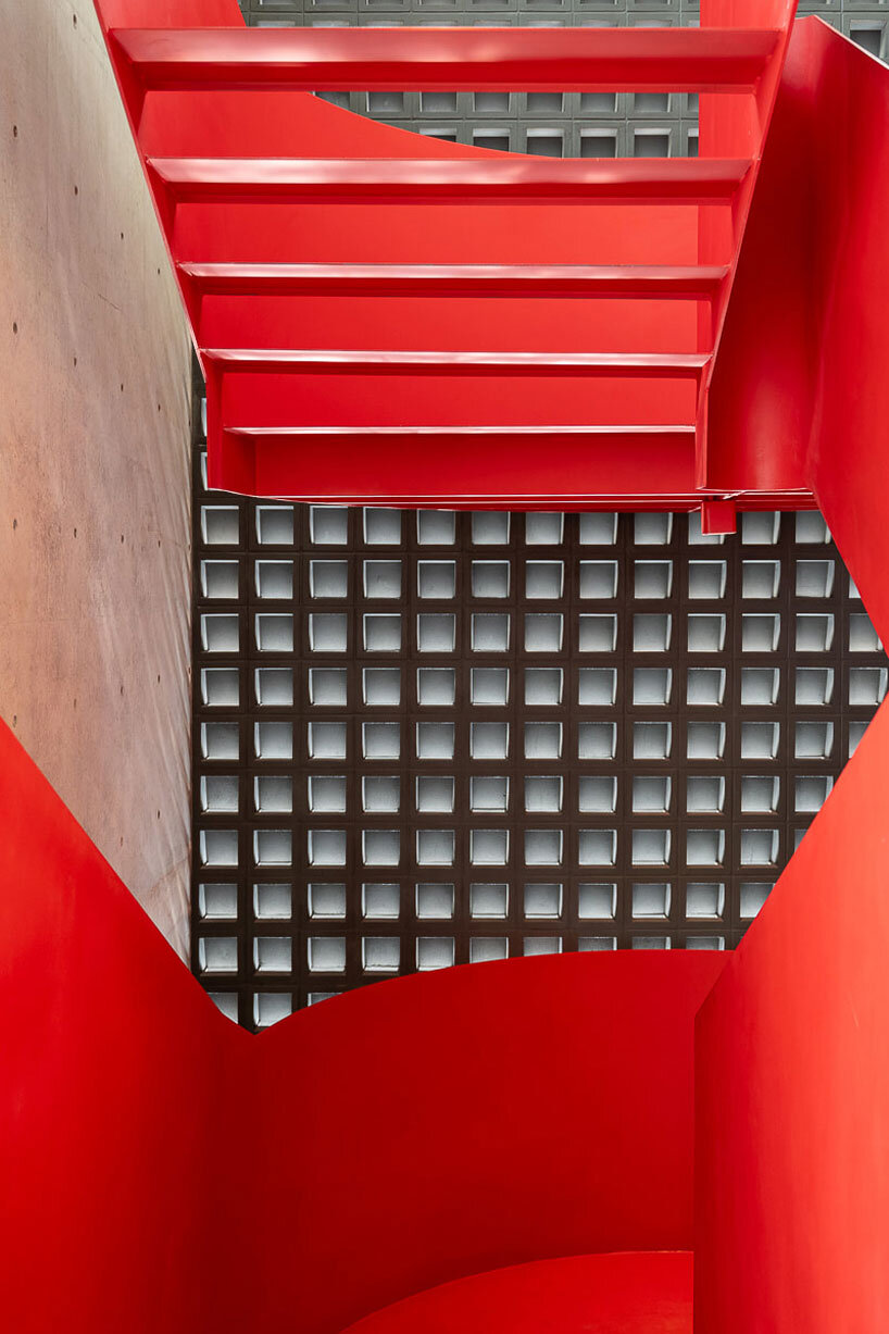 a red steel staircase contrasts with the solidity of fair-faced concrete