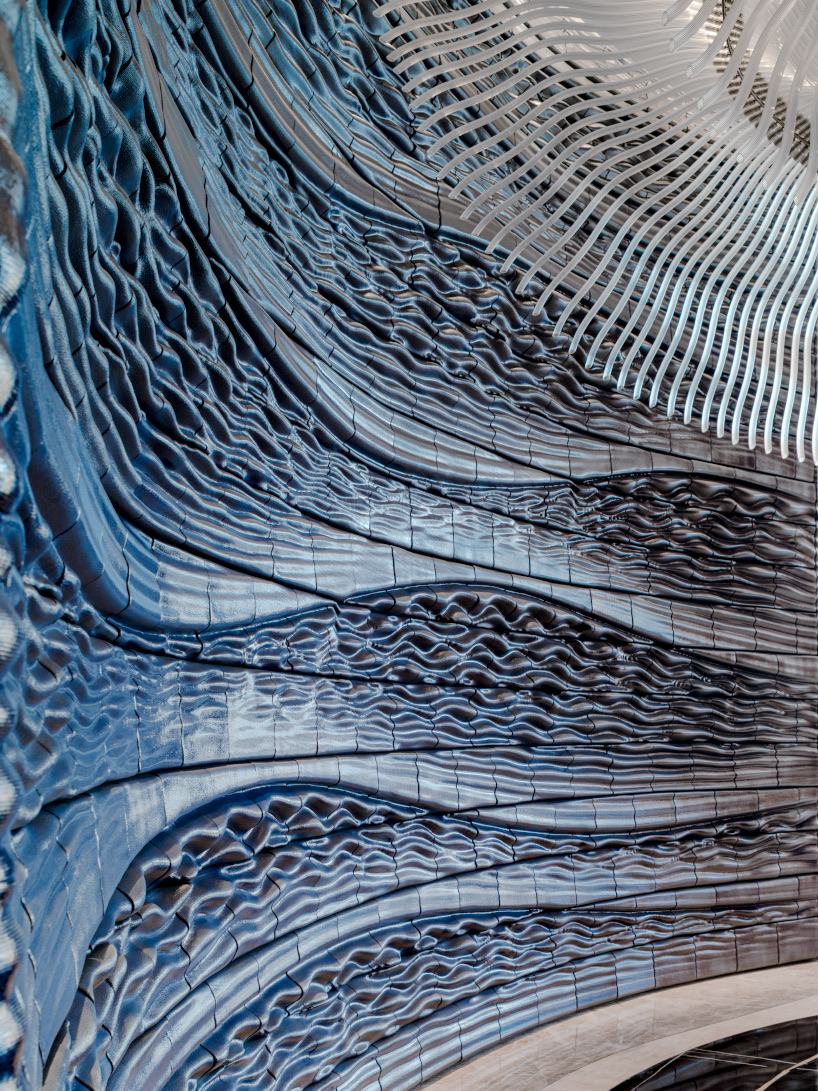 Positioned on either side of the main lobby entrance, the walls measure six meters in height and nine meters in length, creating a sculptural threshold between the exterior and interior. The project draws from the movement of the nearby Gulf, translating the dynamics of water into a series of fluid, wave-like forms. Each surface is composed of thousands of flowing lines that shift in density and depth, producing a tactile gradient that interacts with natural and artificial light throughout the day.